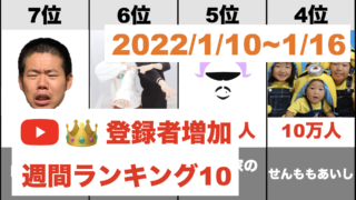【登録者増加】国内YouTubeチャンネル週間ランキングトップ10 2022年1月10日~2022年1月16日